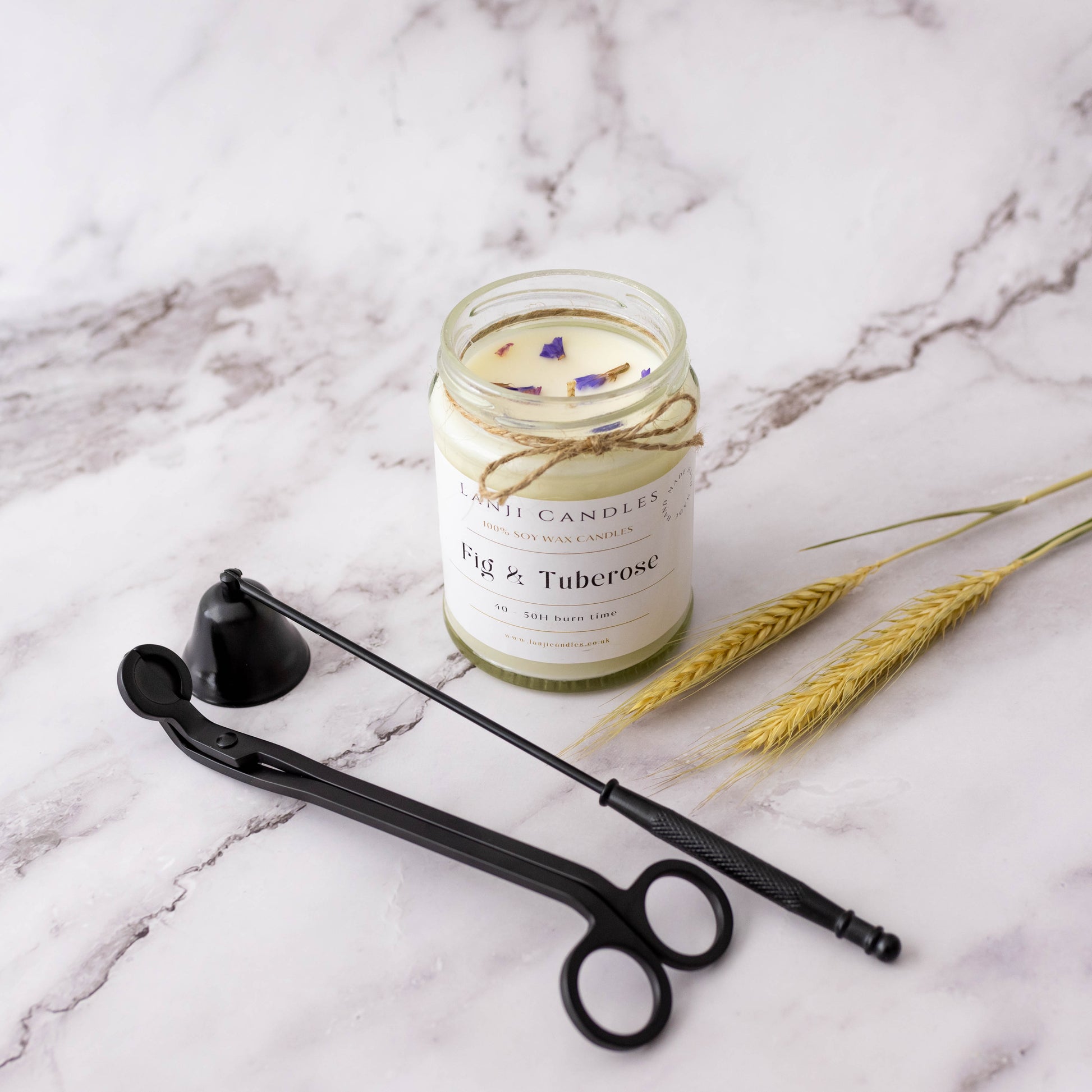 Fig & Tuberose scented candle features a delicate chypre blend of top notes of blackcurrant and green fig leaves, with a heart of white tuberose, and a warm base of musk. Create a warm and inviting atmosphere with this delectable, natural fragrance.